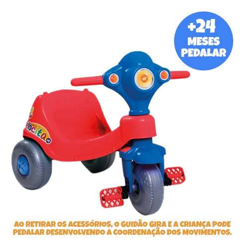 O Velocita estimula a coordenação motora fina, através da brincadeira com os acessórios didáticos e também a coordenação motora grossa através do ato de pedalar. Para a versão pedal é só retirar os acessórios, e pronto os pequeninos podem pedalar livremente. Além disso, os pequenos podem levar sua garrafinha de água no suporte atrás do carrinho.